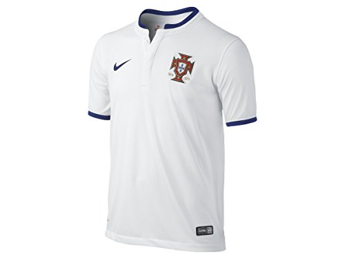 Official 2014-15 Portugal Kids Away Shirt available to buy online. This is the new football shirt of the Portuguese National Team which will be worn in the 2014 World Cup Finals.The new junior Portugal football kit is manufactured by Nike and is available to buy in childrens sizes Small Boys, Medium Boys, Large Boys, XL boys.You can personalise your kit with shirt printing in the Nike style with your favourite stars including Cristiano Ronaldo or even your own custom name and number. All our Portugal football shirt printing includes the small number on the front of the top.This is the official Portugal World Cup football shirt which will also be worn in the qualifying campaign for the next European Championships.Show off your support and look like one of the team with the Nike Portugal Away Shirt 2014 Juniors with the Emblem embroidered on the left chest and Nike Swoosh to the right, complete with a hooped pattern around the whole shirt. This Away Football Shirt is constructed with Nike Dri-Fit technology which is designed to move moisture away from the skin to keep you dry and comfortable for longer, whilst the V neck and short sleeves provide a classic look. > Junior Football Shirt > V neck > Short Sleeves > Dri-Fit > Portugal emblem > Nike Swoosh > Hooped pattern > 100% polyester > Machine washable Product Code 577983-105